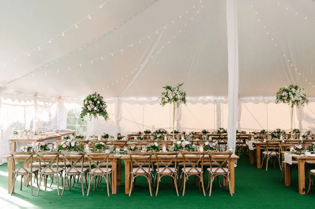 Whether you’re planning a romantic tented reception, chic outdoor ceremony, or intimate gathering, our inventory has everything you need — premium tents, tables, chairs, linens, dinnerware, glassware, lighting, staging, and climate control.
